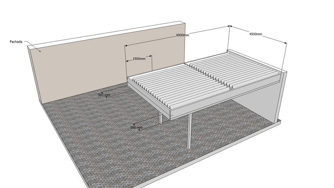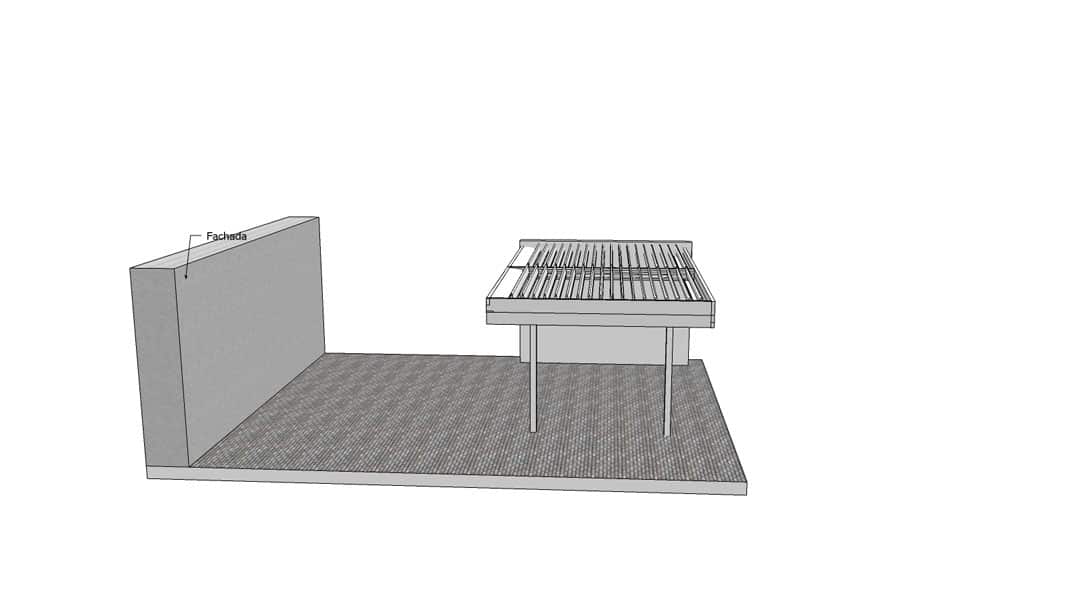 Por el mismo motivo, y atendiendo a cuestiones estéticas y de diseño determinadas por el cliente, 2 de los postes se ubicaron dentro de una pared de hormigón que se fabricó posteriormente a la instalación de la pérgola para garantizar la rigidez de la estructura. Los otros 2 postes que quedaban a la vista se desplazaron 1500 mm de las esquinas.
