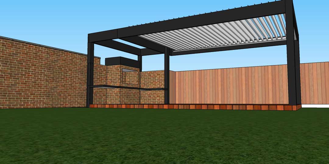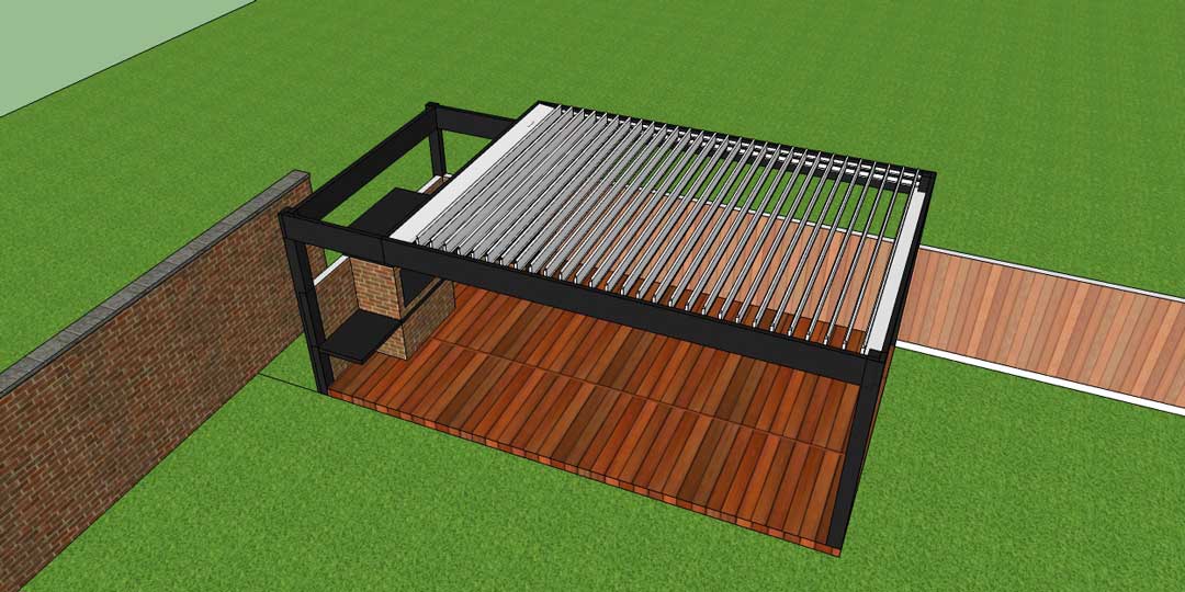 En este caso, se puede ver en las imágenes las dos configuraciones. En primera instancia se pide una estructura plana solidaria descubierta de diseño en la línea de la barbacoa. Es una solución estética y de diseño interesante según las particularidades de cada instalación y su entorno.