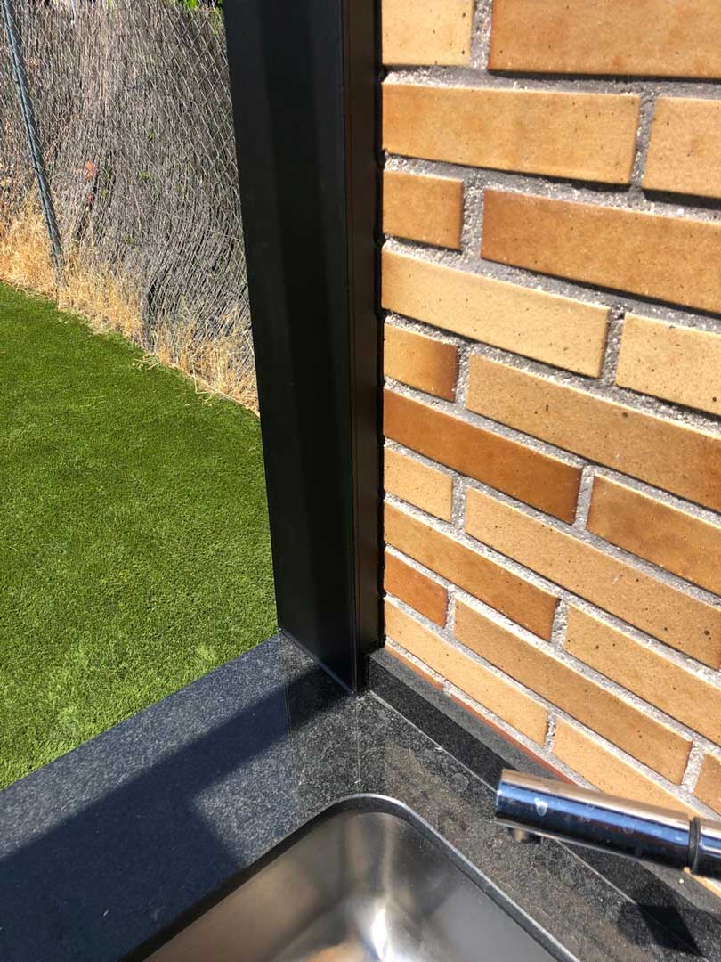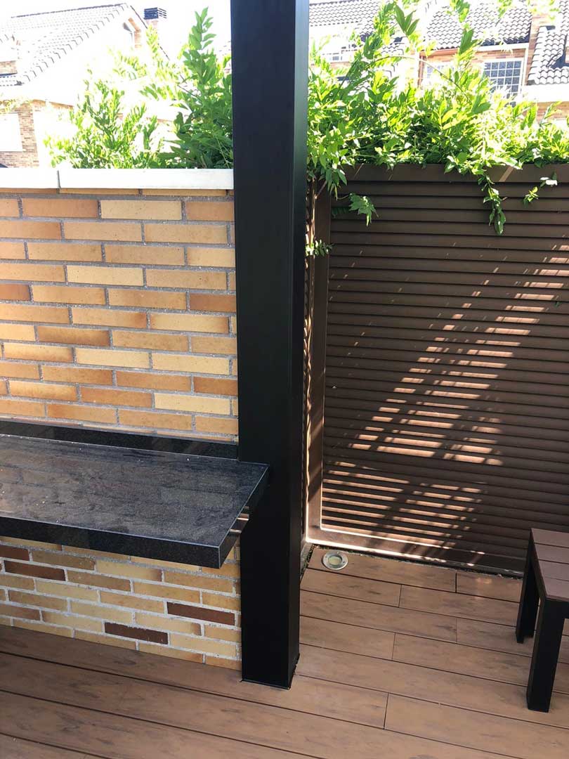 Para integrar la pérgola con la estética de la terraza, colocamos la estructura de color negro, que combinaba a la perfección con los colores de la carpintería de la barbacoa. Para las lamas, le cambiamos el tono a un color blanco que le aporta luminosidad amplitud y claridad.