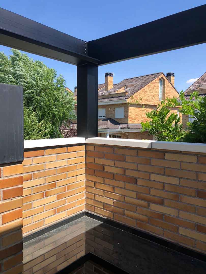 Por deseo del cliente, la instalación de esta Pérgola Bioclimática de lamas orientables y motorizada se realizó con 5 postes, de los cuales dos eran autoportantes para la zona más alejada de la barbacoa y los tres pilares restantes se colocaron completamente integrados en los muros de la barbacoa que nuestro cliente ya tenía fabricada en materiales de obra.