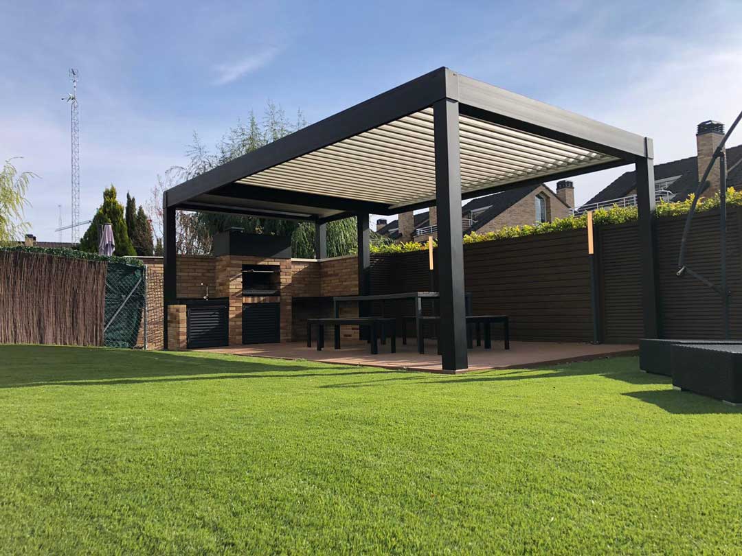Pérgola Bioclimática de lamas orientables motorizada con diseño adaptado a una zona de barbacoa.