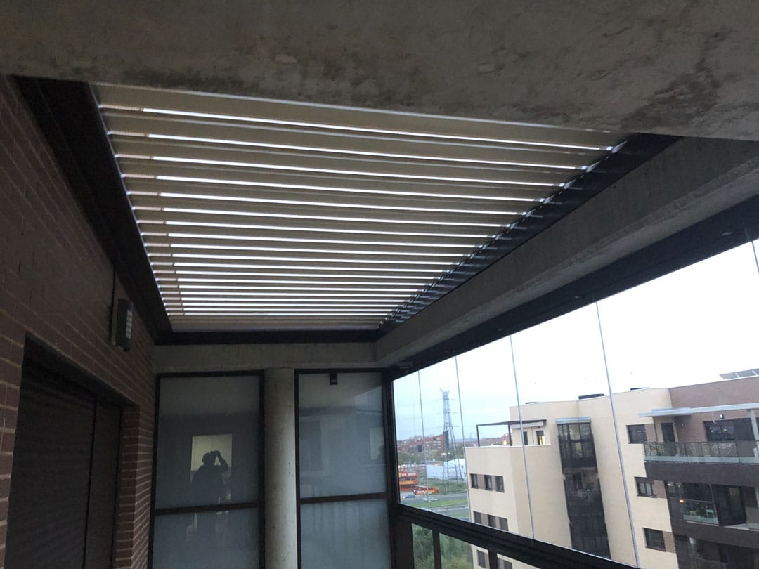 Instalación de Pérgola Bioclimática de Lamas Retráctiles con Cortina de Cristal en una terraza de Getafe en Madrid