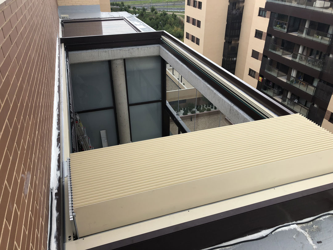 Pérgola Bioclimática retráctil autoportante de 1 módulo sin postes instalada en hueco de estructura de hormigón existente. Color de la estructura RAL 8017 mate y color de las lamas RAL 1015 mate. Sistema de accionamiento motorizado vía radio mediante mando a distancia. Sensor de viento. Se añade un Cerramiento con Cortina de Cristal.