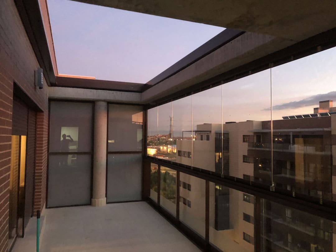 La Cortina de Cristal instalada se fijó en el vuelo de la estructura de hormigón y se apoyó sobre la barandilla de la terraza en forma de ‘L’ cuyas hojas de vidrio quedaban recogidas en un lateral en la apertura para liberar el máximo de espacio. Sobre dicha barandilla se colocaron remates de chapa para evitar filtraciones de agua y un fijo de vidrio en acabado mate en la división de terraza con la terraza vecina para crear mayor intimidad.