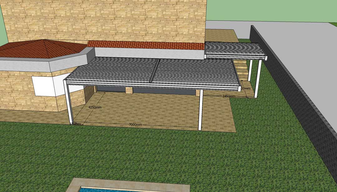 Nuestro departamento de i+D nos plantea una solución viable para este proyecto que es dotar a la pérgola de una distancia entre pilares de 7000 mm y sumarle un vuelo de viga que contrarreste “el flexe” que dicha distancia genera en la viga frontal.