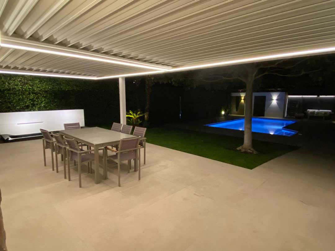 Pérgola Bioclimática Orientable motorizada con un diseño adaptado y totalmente integrado a la estética y materiales del chalet.
