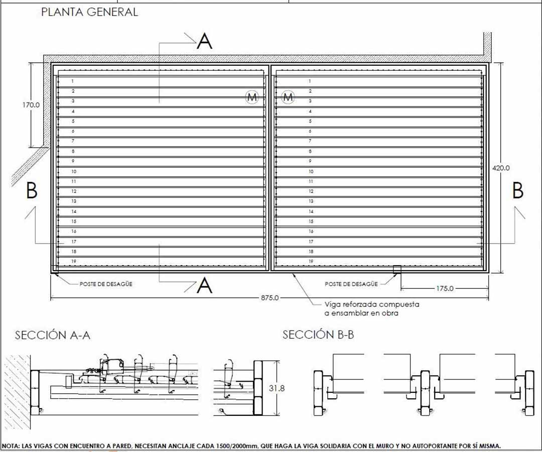 Para poder cubrir una superficie de 36 m2 se requería colocar 3 postes en la línea frontal ya que teníamos una Pérgola Bioclimática de 8750 mm. Nuestro producto cubre una distancia máxima entre postes de 7000 mm y eso nos limitaba las soluciones técnicas.