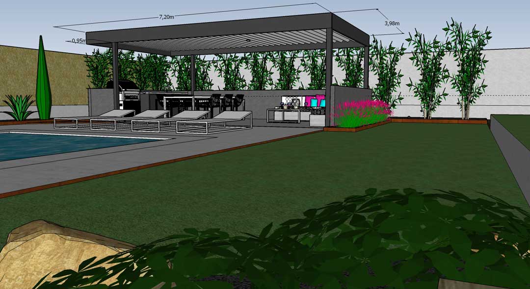 Nuestro cliente solicitaba una pérgola para cubrir una parte adyacente a su piscina donde colocaría una zona de estar y una barbacoa. Cuando realizamos la visita en obra, diseñamos la estructura a la medida del muro de obra para dejar los pilares integrados con los muros perimetrales.