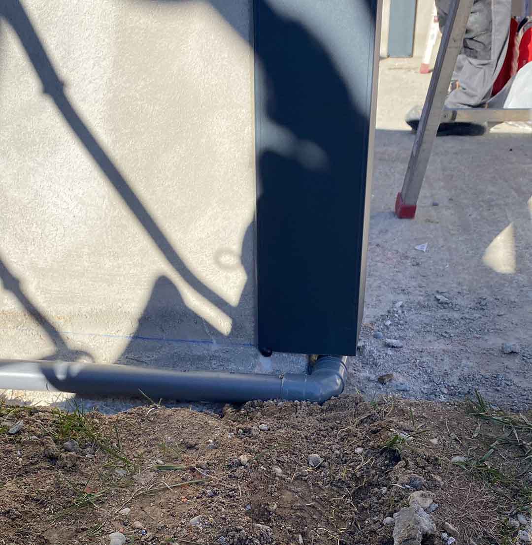 Su cliente le solicitaba una zona apartada en el jardín para colocar una mesa y una barbacoa junto a la zona de la piscina de vaso desbordante.Colocamos los pilares en el perímetro del murete que rodeaba la estancia con la intención de rematar estéticamente las paredes y ocultamos las bajantes de agua en el suelo.